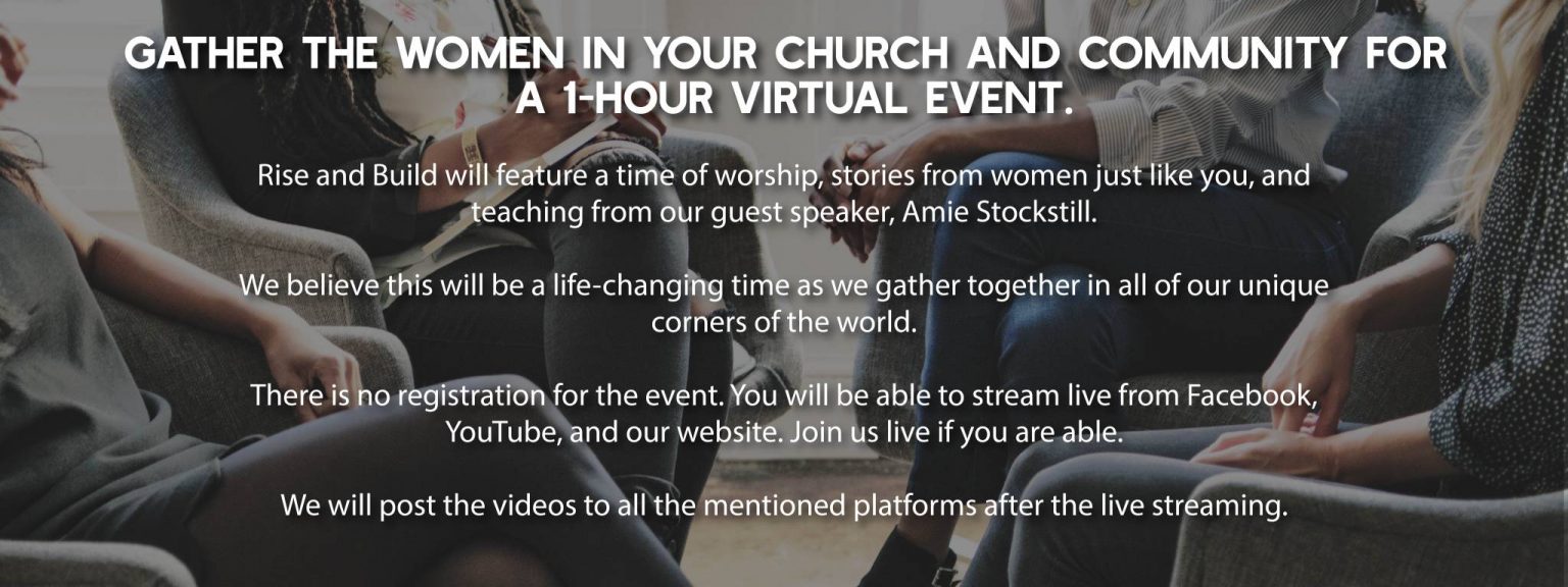Gather the women in your church and community for a 1-hour virtual event. Rise and Build will feature a time of worship, stories from women just like you, and teaching from our guest speaker, Amie Stockstill. We believe this will be a life-changing time as we gather together in all of our unique corners of the world. There is no registration for the event. You will be able to stream live from Facebook, YouTube, and our website. Join us live if you are able. We will post the videos to all the mentioned platforms after the live streaming.